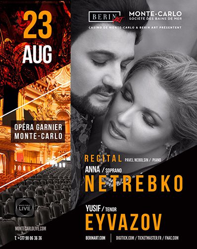 Tickets go on sale for an outstanding opera evening with Anna Netrebko and Yusif Eyvazov in Monaco. Berin Art and Casino de Monte Carlo present: a unique evening with soprano Anna Netrebko and tenor Yusif Eyvazov. On August, 23 for one night only at exclusive salle Garnier two opera’s biggest stars will perform a recital accompanied by Pavel Nebolsin (piano).