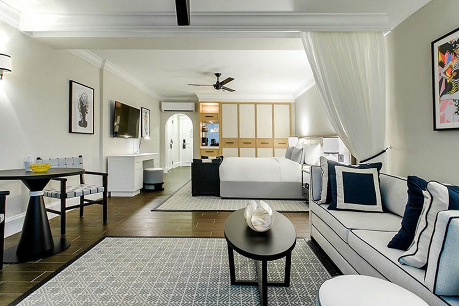 Der sanfte Klang der Wellen findet Sie überall, durch die eleganten, offenen Bögen, die die Hauptbereiche charakterisieren. Jedes der 72 neu renovierten Zimmer hat einen Meerblick – das Upgrade führte zu einem modernen, luftigen Ambiente mit beruhigenden Tönen aus der Umgebung und der Arbeit der lokalen Künstlerin Sheena Rose.
