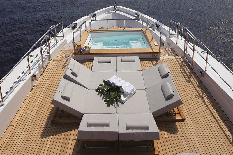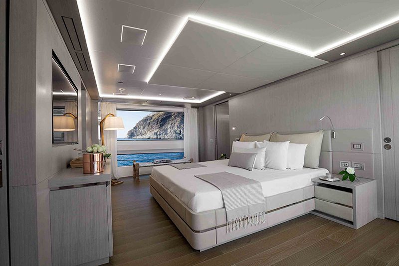 Die Innenarchitektur von Oli wurde so entworfen, dass sie bis zu 10 Gäste in 5 Kabinen bequem Platz bietet. Dazu gehören eine Master Suite, 2 Doppelkabinen und 2 weitere Kabinen. Die Luxusyacht ist in der Lage eine Yachtcrew von 7 Leuten zu beherbergen.