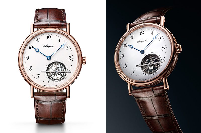 11 Uhr platziert. Genau gegenüber bei 5 Uhr befindet sich das Tourbillon. Die Anordnung der unterschiedlichen Elemente erinnert stark an die von A.-L. Breguet entworfenen Taschenuhren, die gewollt mit den ästhetischen Gepflogenheiten der damaligen Zeitmesser brachen.