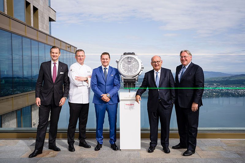 Bürgenstock Resort, und Mike Wehrle, Culinary Director. Jeder Zeitmesser trägt die auf der Unterseite des Gehäuses eingravierte Widmung «Hotel des Jahres 2019».