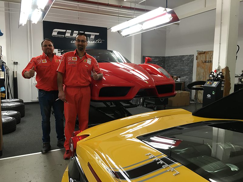 Alexander scheut keine Kosten, er bietet seinen exklusiven Kunden, nur die beste Qualität. Oben Alexander und der Mitarbeiter, Piero ( er hat 6 Jahre lang in Maranello bei Ferrari im Werk gearbeitet) und ist bei CULT Car Concierge der Karosserie Spezialist. Beide haben auf dem Bild die Original Ferrari Werksbekleidung von Ihm an ( Piero hat auf dem ENZO Ferrari gearbeitet und auf Maserati MC12.) Im Hintergrund ist ein Enzo zusehen, der von CULT Car Concierge
