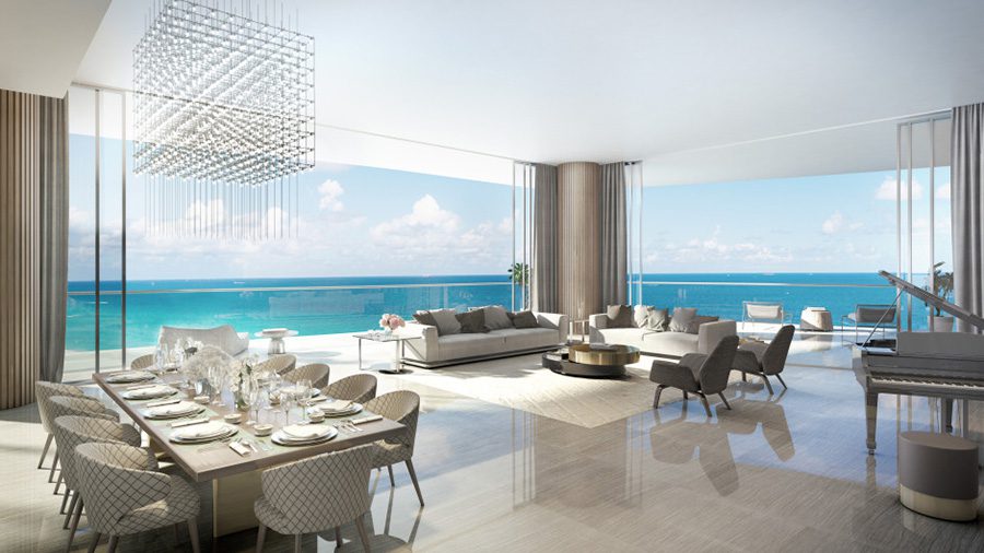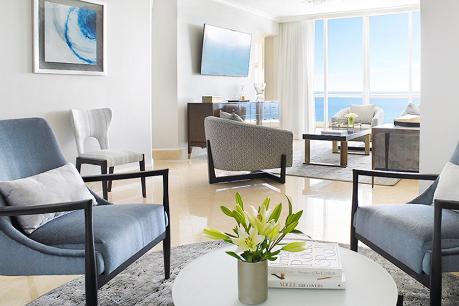 Die 2.375 Quadratmeter große Suite, die vom Eigentümerteam des Resorts zusammen mit dem in Florida ansässigen Designbüro SBI entworfen wurde, „hat eine ruhige Eleganz, die ein hohes Maß an Komfort und Ruhe bietet“, beschreibt Deborah Yager Fleming, CEO & Partner des Acqualina Resorts.