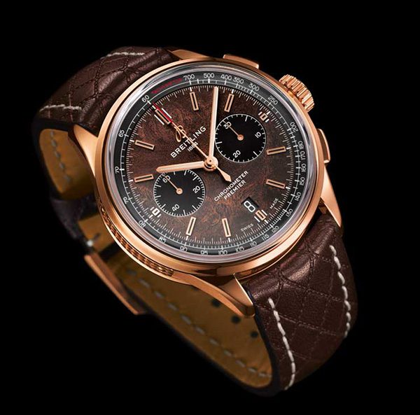 Die Uhr verfügt über ein blaues Alligatorlederarmband mit blauen und roten Akzenten und lässt an das Innere des Show-Fahrzeugs denken. Auch das vertikal gebürstete silberne Zifferblatt der Premier erinnert an die Breitling Uhr im Armaturenbrett des Fahrzeugs und ergänzt deren arabische Ziffern: 3, 6, 9, 12 bei der Uhr im Armaturenbrett und 1, 2, 4, 5, 7, 8, 10, 11 beim Chronographen. Die Aufteilung dieser Ziffern zwischen den beiden Uhren ist eine Anspielung auf ihre gemeinsame Design-DNA. Auf der linken Seite des Gehäuses befindet sich eine Platte mit «Bentley»-Gravur, deren Design auf dem im Engine-Spin-Schliff gehaltenen Armaturenbrett historischer Bentleys basiert. Die Premier Bentley Mulliner ist auf 1000 Stück limitiert, und jedes Stück trägt die Gravur „ONE OF 1000“