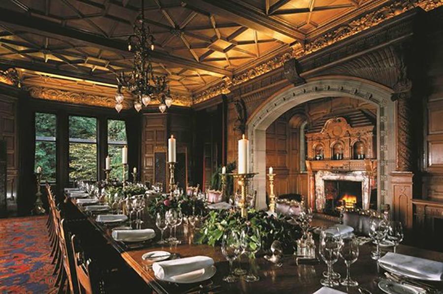 Beim Betreten des prächtigen Schlossportals wird das Auge des Betrachters sofort von den Glasfenstern über der Haupttreppe angezogen, von denen eines Carnegies frühes Leben darstellt. Die überwiegend aus Eichenholz bestehende Täfelung im gesamten Schloss verleiht den Räumen eine Wärme ohne die Düsternis dunkleren Holzes. Nirgendwo wird dies deutlicher als im Speisezimmer von Herrn Carnegie, das praktisch von Wand zu Wand mit Eichenholz aus dem Skibo-Anwesen verkleidet ist.