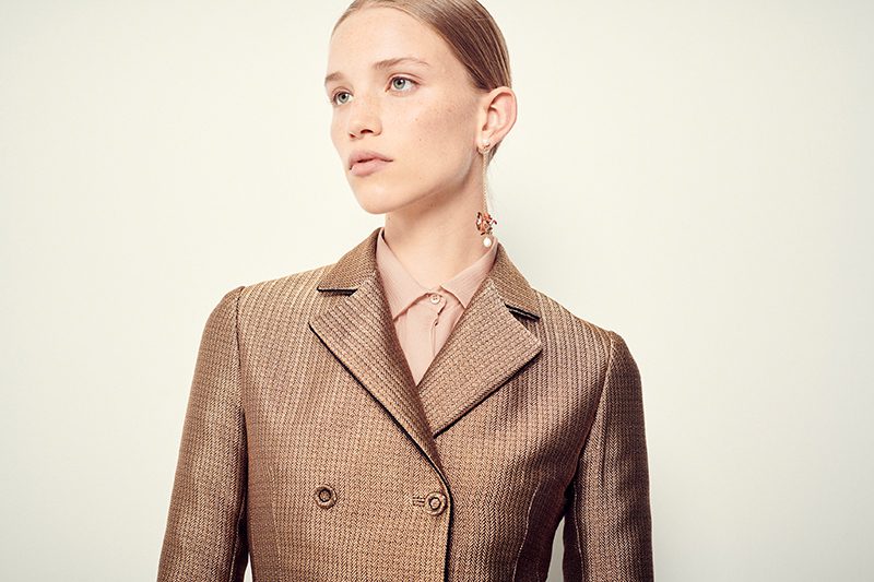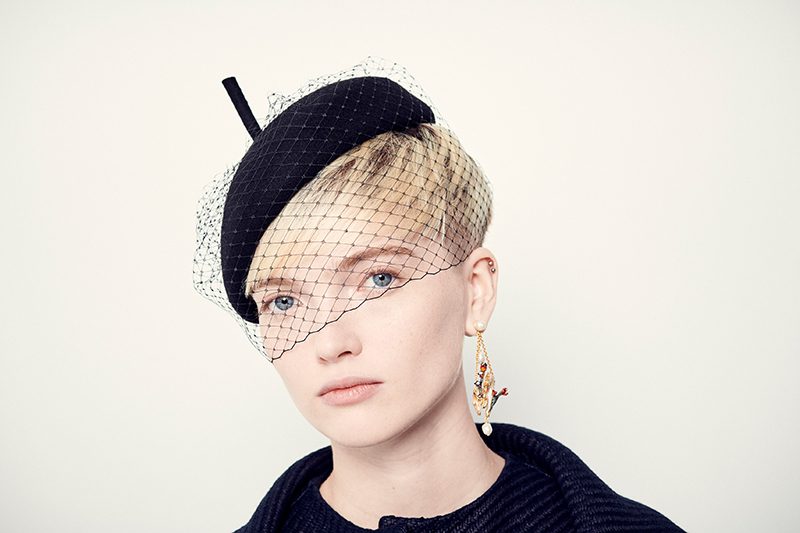 Die Pudrige Farbpalette (Ziegelrot Grün, Rosa oder Orange) im Dialog mit Nude färbt die Kleider und die Accessoires – Modeschmuck, Schleier und Hüte.Wie eine Fortsetzung des Körpers, dem die Couture die Ehre erweist.