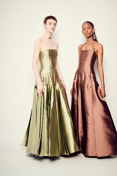 Die Abendkleider bleiben mit ihren verschiedenen Plissees oder verspielten Überlagerungen und bilden einen Kontrast zu schlichten Bustiers, die eine überraschende Disharmonie bieten.