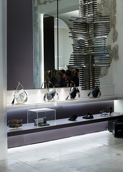 Das 600 Quadratmeter große Einkaufszentrum wurde vom renommierten italienischen Architekten Vincenzo de Cotiis entworfen und ist ein zeitgenössischer Ausdruck von Kunst, Form und Funktion, der Tradition und Innovation nahtlos verbindet. In drei verschiedenen Verkaufsbereichen befinden sich die Herren-, Damen- und Accessoire-Kollektionen, umrahmt von Plüschsamt, freiliegenden, zeitgemäßen Wänden, Plexiglaseinbauten, Marmor- und Bronzereinrichtungen.