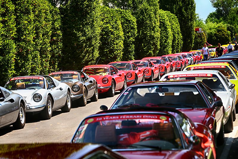 Im Rahmen der Veranstaltung zum 50. Jahrestag der Jungfernfahrt des ersten Exemplars des Wagens sind am Samstag, 30. Juni, über 150 Dinos und mehr als 300 Kunden aus der ganzen Welt nach Maranello und zu Ferrari geströmt.
