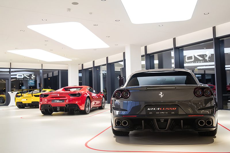 Der galerieartige Ausstellungsraum kann bis zu 13 Ferraris beherbergen und wird durch die sieben auf der Servicefläche befindlichen Parkbuchten unterstützt. Durch das Anbieten direkter Lieferungen und Parkmöglichkeiten im Winter, der in Österreich anerkannten Straßeninspektion sowie luxuriöser Verzierungen ermöglicht das Ferrari-Team die ganzheitliche Rosso-Erfahrung.