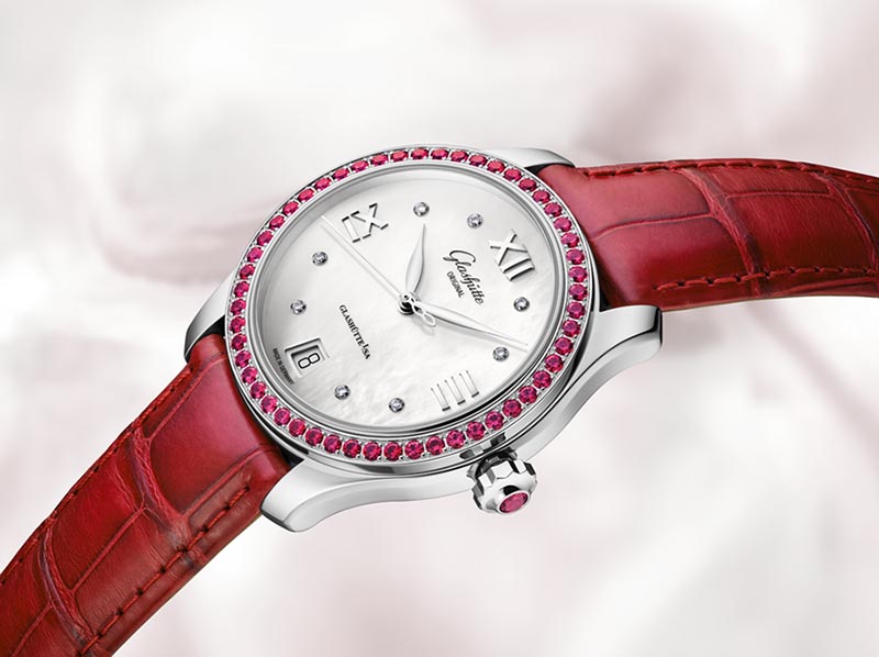Glashütte Original präsentiert mit der neuen Lady Serenade in Rubinrot ein, vom Valentinstag inspiriertes Sondermodell, das weltweit auf 50 Stück limitiert ist. 52 leuchtende Rubine zieren die Lünette des Edelstahlgehäuses von 36 mm Durchmesser und repräsentieren je eine Woche des Jahres.