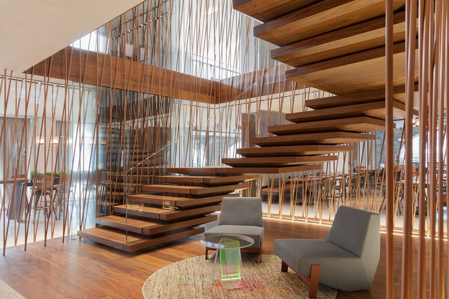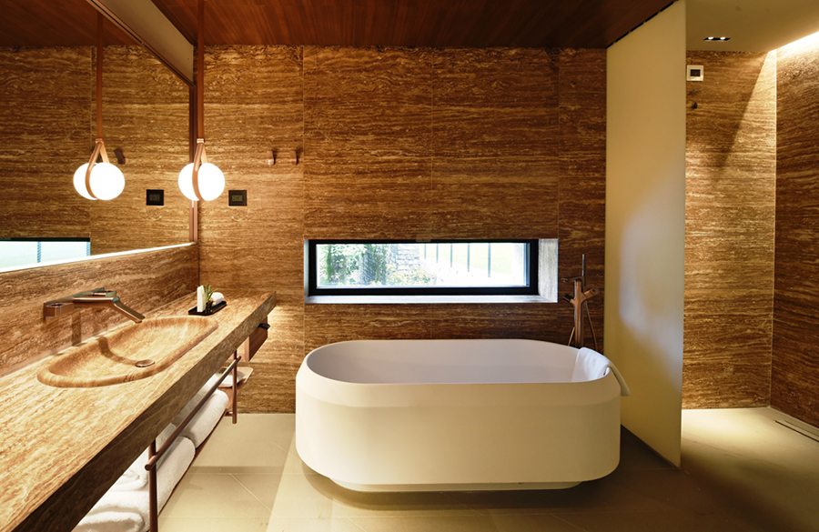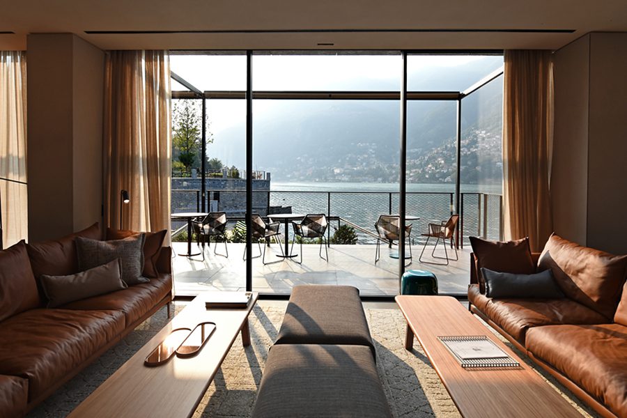Während die spektakuläre Aussicht auf den Comer See und die umliegenden malerischen Bergketten Ihre Aufmerksamkeit im Freien beanspruchen wird, ist es das Zentrum des Hotels, das Ihnen im Inneren den Atem rauben wird. Während Sie hineingehen, werden Ihre Augen auf die atemberaubende Treppe gezogen, die als wahrhaft markanter Mittelpunkt dient. Hergestellt aus natürlichen Materialien wie Nussbaumholz, sind die großen Stufen mit Bronze ummantelt und schweben mühelos, während Sie davorstehen. Die dunklen und schönen Adern des Walnussholzes ergänzen den Stein, der im ganzen Hotel zu finden ist. Ein spannender Ausgangspunkt für das Design im Rest des Hotels, das ebenfalls sehr zeitgemäß ist. Patricia Urquiola hat weitgehend natürliche Materialien wie Holz, Stein, Wolle und andere Stoffe verwendet, und der Gesamteindruck ist sowohl fantastisch als auch erfrischend zeitlos. Urquiola hat auch Farben verwendet, die den See und die Umgebung widerspiegeln.