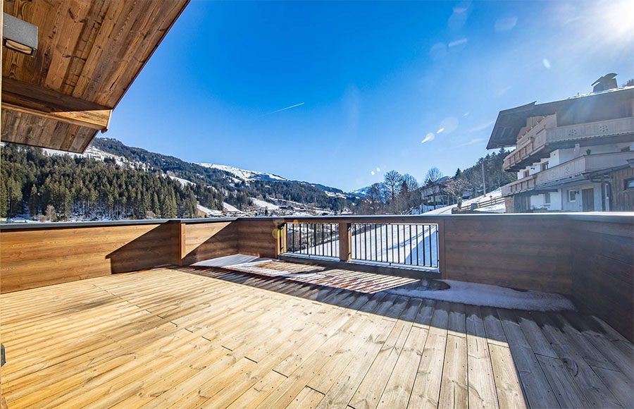 Ein großer Balkon, welcher von beiden Richtung Osten ausgerichteten Schlafzimmern erreichbar ist, ladet ein das gebotene Bergpanorama zu genießen.