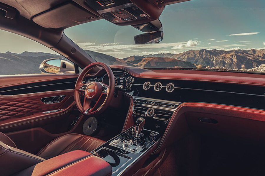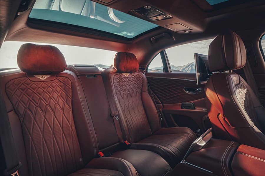 Luxuriöses Interieur – Bentley Flying Spur, hat eine der edelsten Innenausstattungen überhaupt. Zur Innenausstattung des Flying Spur gehören unter anderem Massagesitze, Verkleidungen aus Walnussfurnier im Kronenschnitt, ein 12,3-Zoll-Touchscreen und einzigartige dreidimensionale Türeinlagen aus rautenförmig gestepptem Leder.