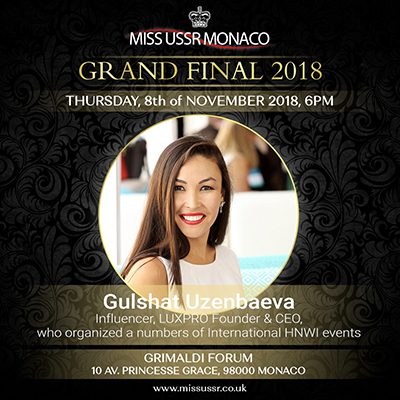 In Monaco der Ort der Superreichen in Europa ist immer etwas los und immer etwas anders, wenn es um Veranstaltungen geht. Am siebten und achten November ist die Monaco International Clubbing Show, ein Zusammentreffen der Weltbesten DJ’s. Am Donnerstag findet auch das Finale der Miss USSR statt. Gulshat Uzenbaeva, Gründerin und CEO von Luxpro ist als Jurymietglied vor Ort.