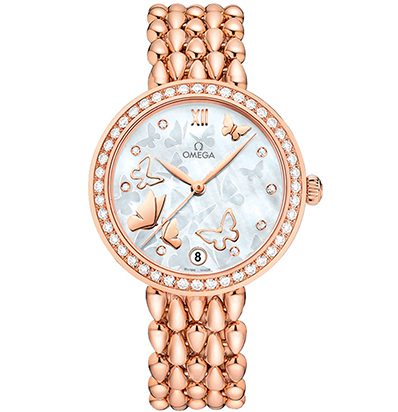 Das Zifferblatt aus weißem Perlmutt bezaubert mit einem goldenen Schmetterlingsdesign; die Datumsanzeige ist bei 6 Uhr positioniert. Diamant-Indizes und eine Diamantlünette krönen diese exklusiven Damenuhr, die vom automatischen Co-Axial Chronometer Kaliber 2500 angetrieben wird.
