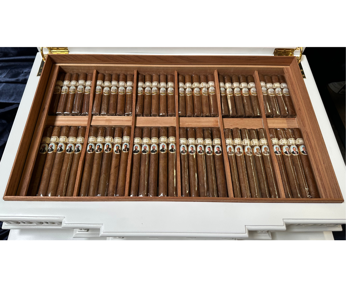 Insgesamt beherbergt der Capitol Humidor 400 eigens gefertigte Daniel Marshall by Carlos Fuente Zigarren. Sie sind auf zwei herausnehmbare spanische Zedernholztabletts verteilt. 360 Zigarren lagern im Hauptfach des Humidors, weitere 40 Stück ruhen im geheimen Kuppelfach – bereit, über Jahre hinweg unter perfekten Bedingungen zu reifen. Zwei klassische Formate stehen zur Verfügung, um sowohl Liebhaber großer Zigarren als auch kompakter Formate zu begeistern: Ein Teil der Zigarren ist als Churchill (ca. 18 cm Länge, Ringmaß 48) gerollt, der andere Teil als Robusto(13,3 cm, Ringmaß 50). Jede dieser Cigarren, mit ihrem aromatisch vielschichtigen Blend und makellosem Deckblatt, ist ein kleines Kunstwerk für sich – geschaffen von Fuentes besten Torcedores (Zigarrenrollern). Beim Öffnen des Humidors strömt Kennern ein würziger Duft gereiften Tabaks entgegen, der die Vorfreude auf einen besonderen Rauchmoment weckt. Dieser Humidor ist somit nicht nur ein Schaustück, sondern auch eine Schatztruhe voller Genießerträume.